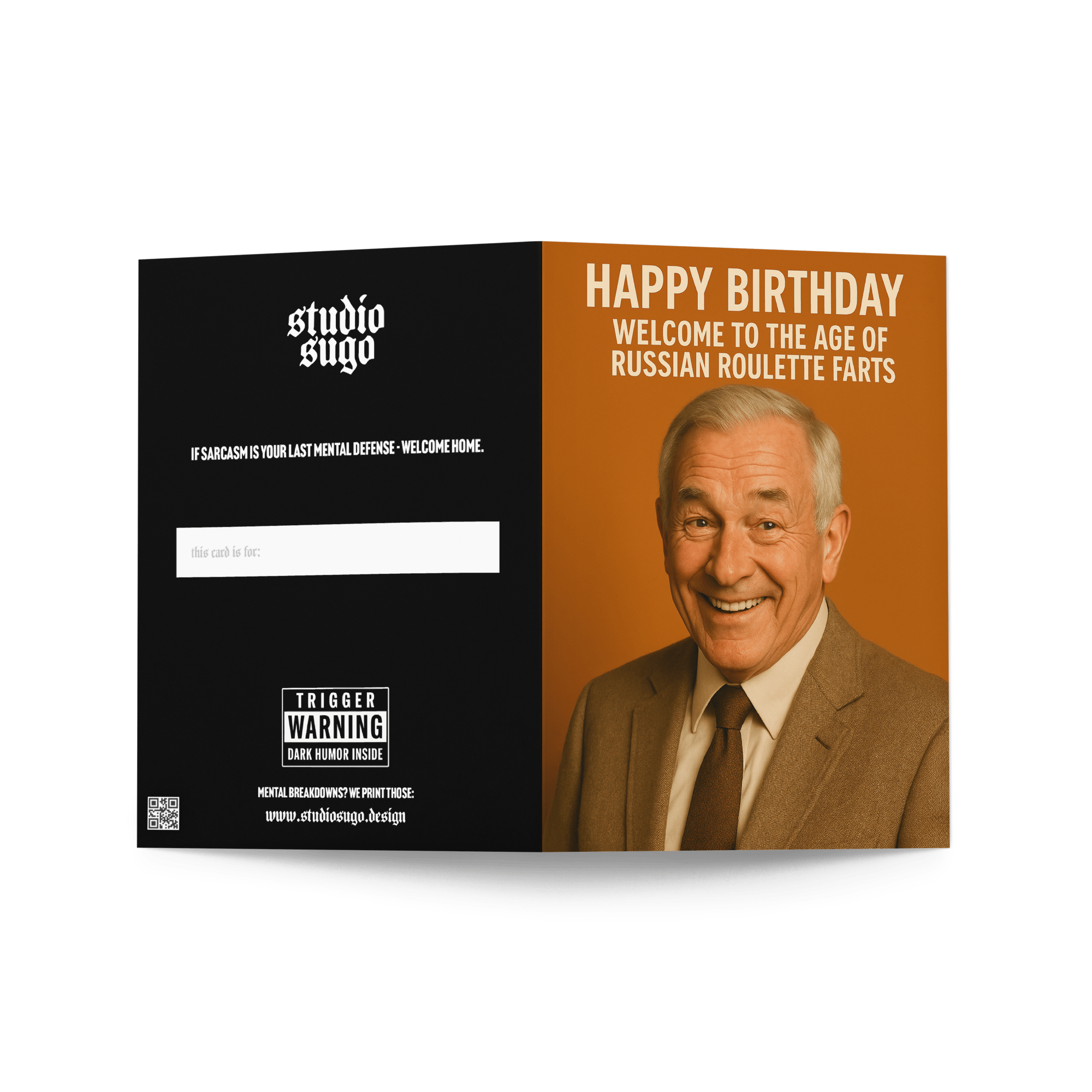 This brutally honest birthday card delivers dark humor straight to the gut (literally). Perfect for that friend, colleague, or relative who’s reached the stage in life where every fart feels like a gamble. Equal parts offensive and hilarious, it’s the ultimate reminder that aging isn’t elegant — it’s unpredictable comedy at its best.